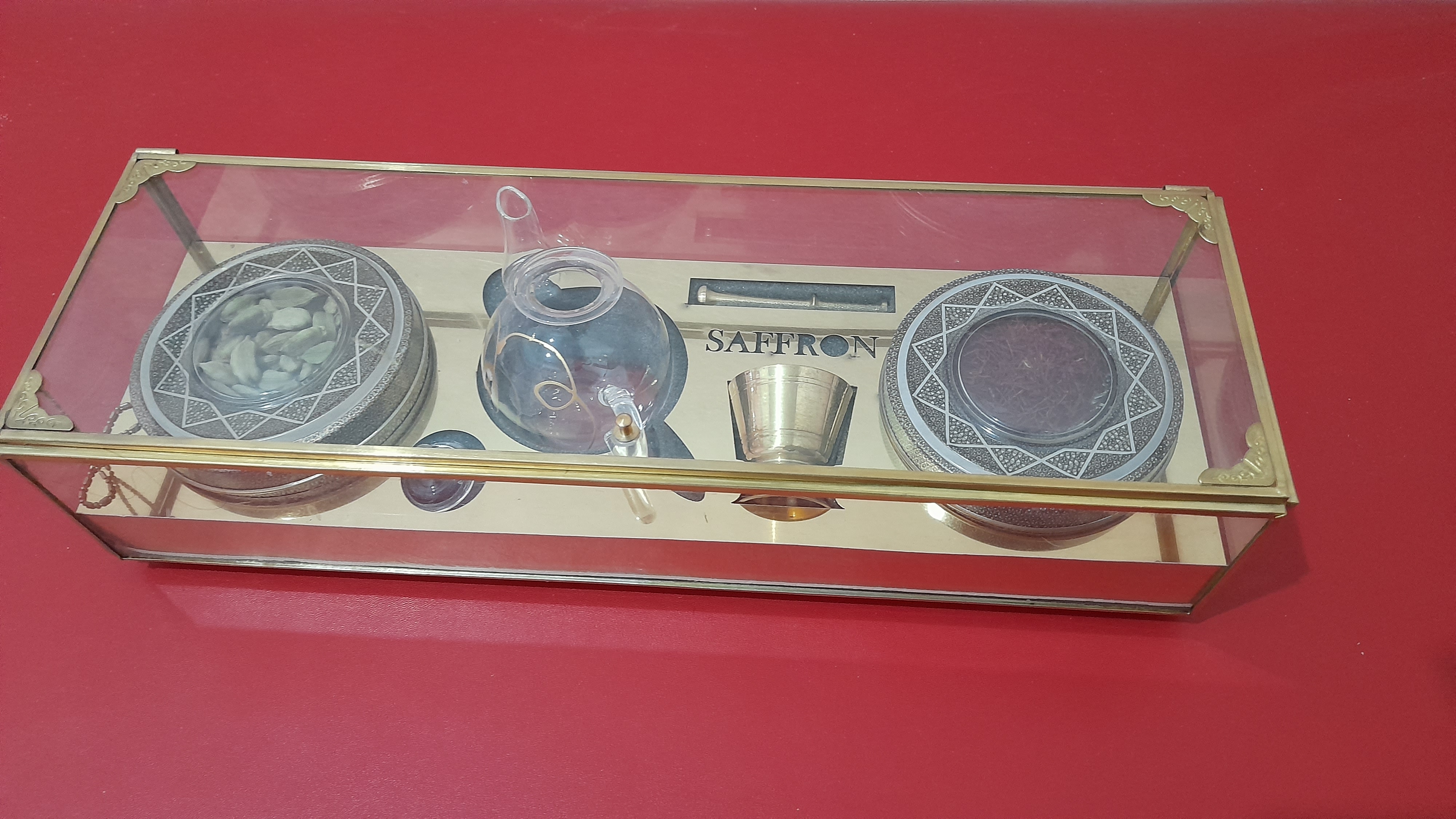 (محتویات زعفران نگین ۵ گرمی، هل ۱۰ گرمی، قوری دستساز دم کنی زعفران، هاون برنجی.)